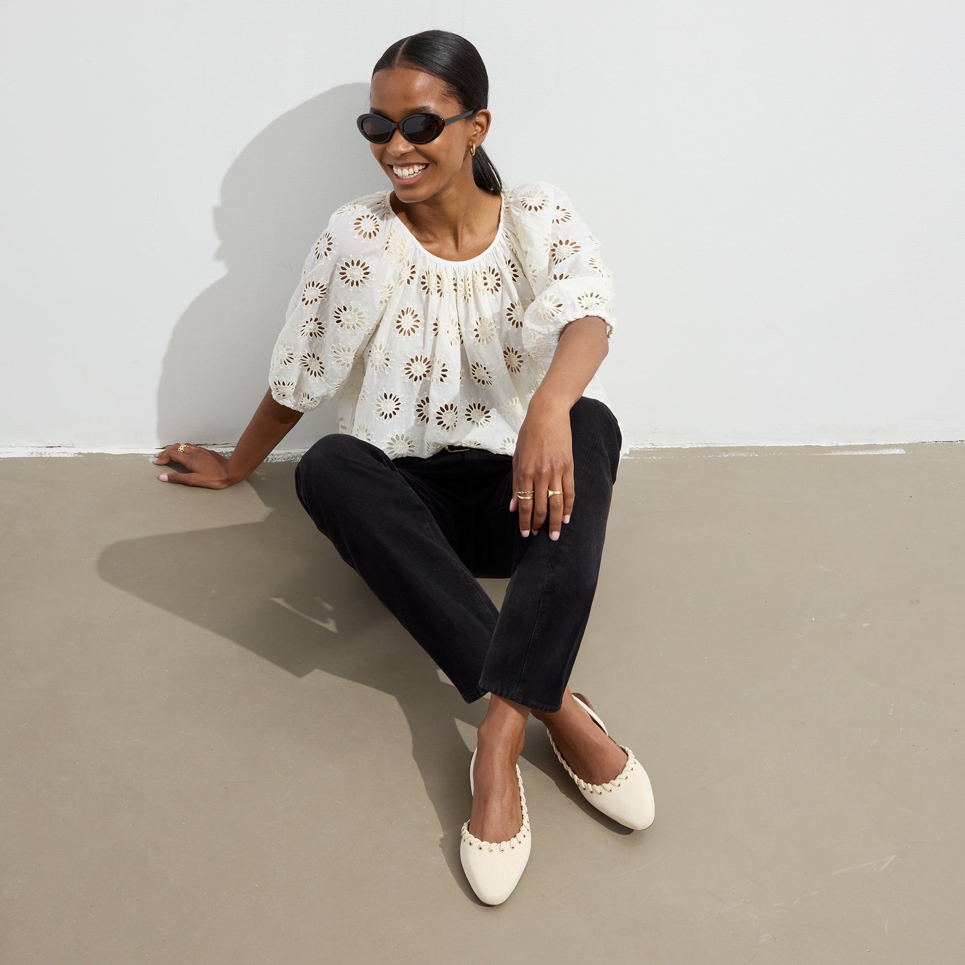 - Soft, flexible upper in ivory with an almond-toe profile.
