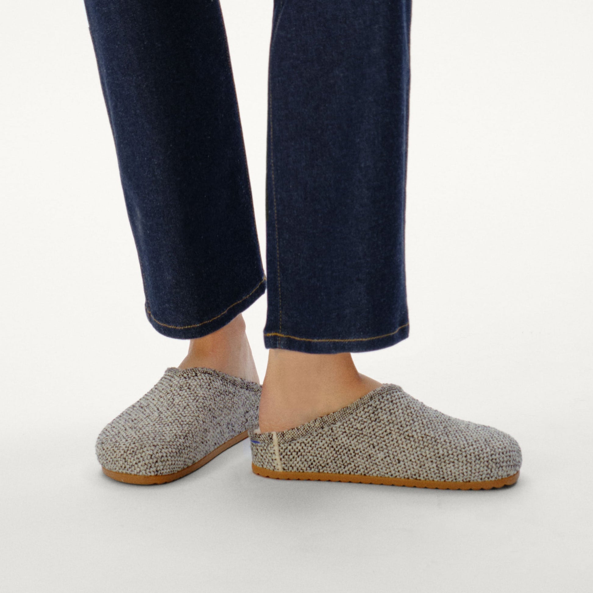 - Soft, V topline upper in a heathered black and grey bouclé texture.