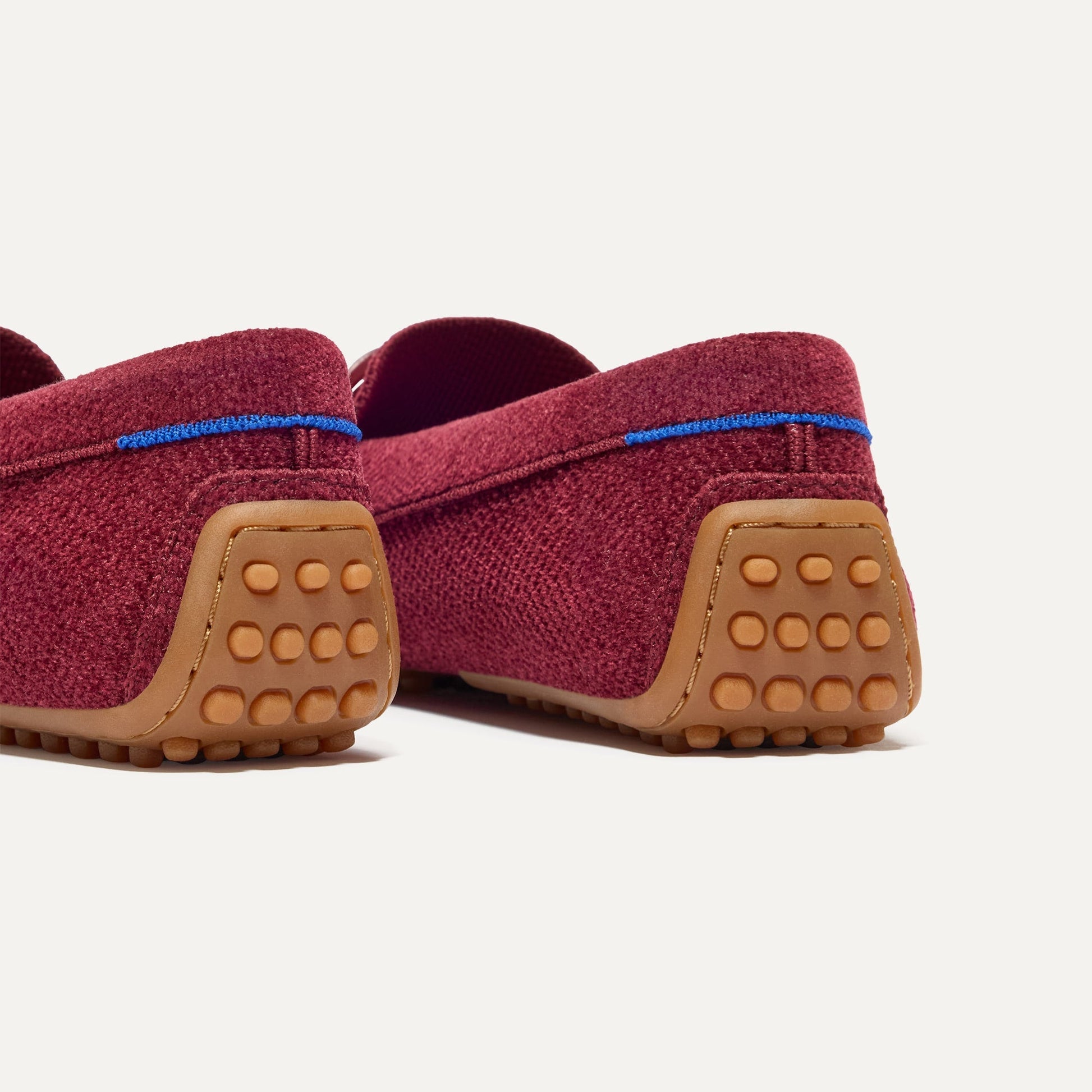 - Soft, flexible upper in deep burgundy with a tonal hardware signet bit on the vamp.