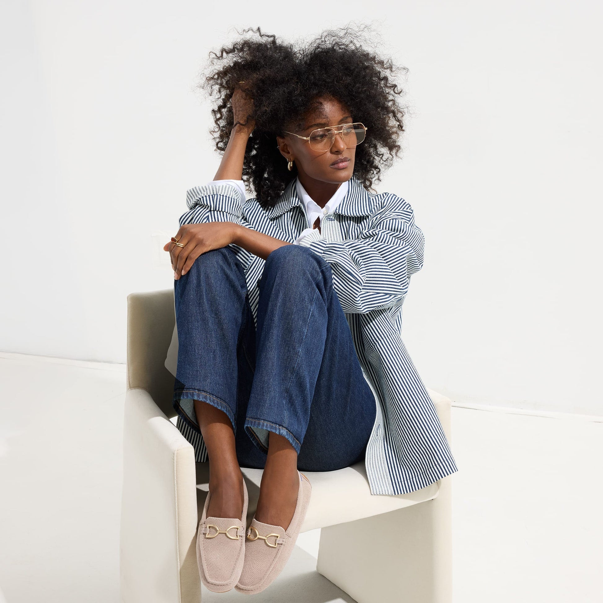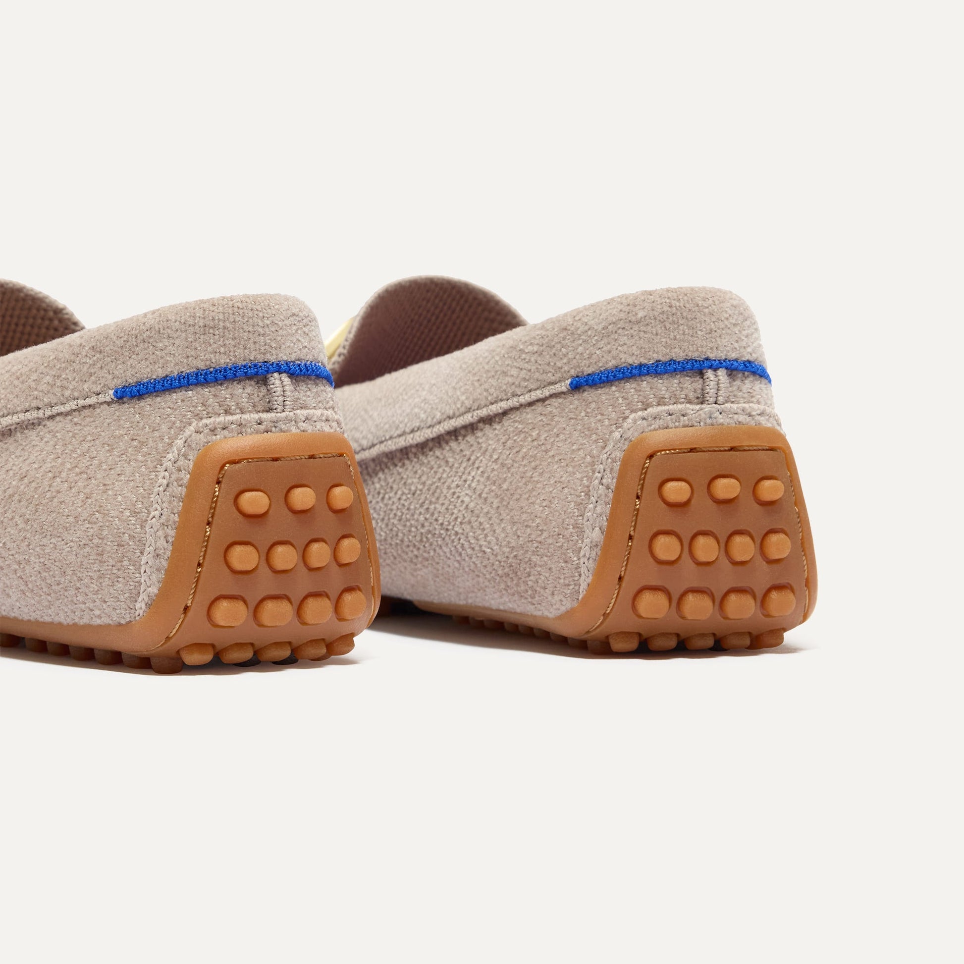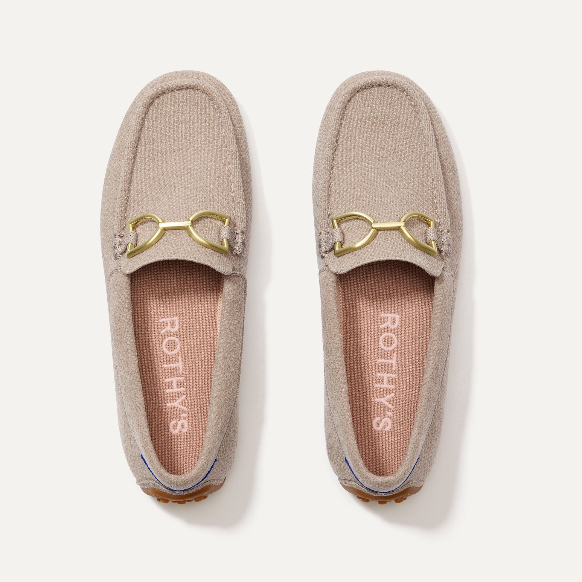 - Soft, flexible upper in cool taupe with a gold hardware signet bit on the vamp.