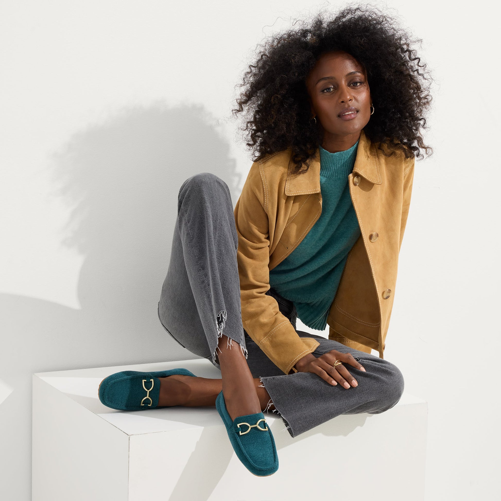 - Soft, flexible upper in jade green with a gold hardware signet bit on the vamp.