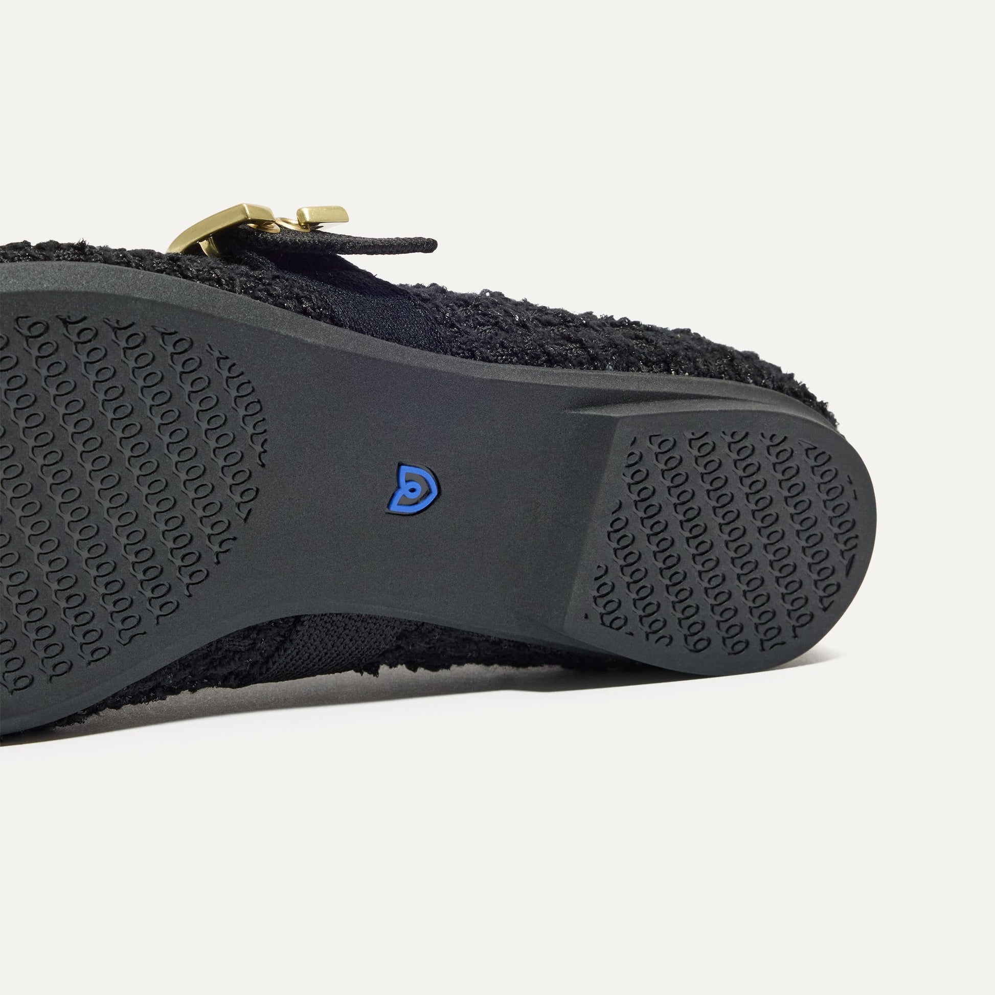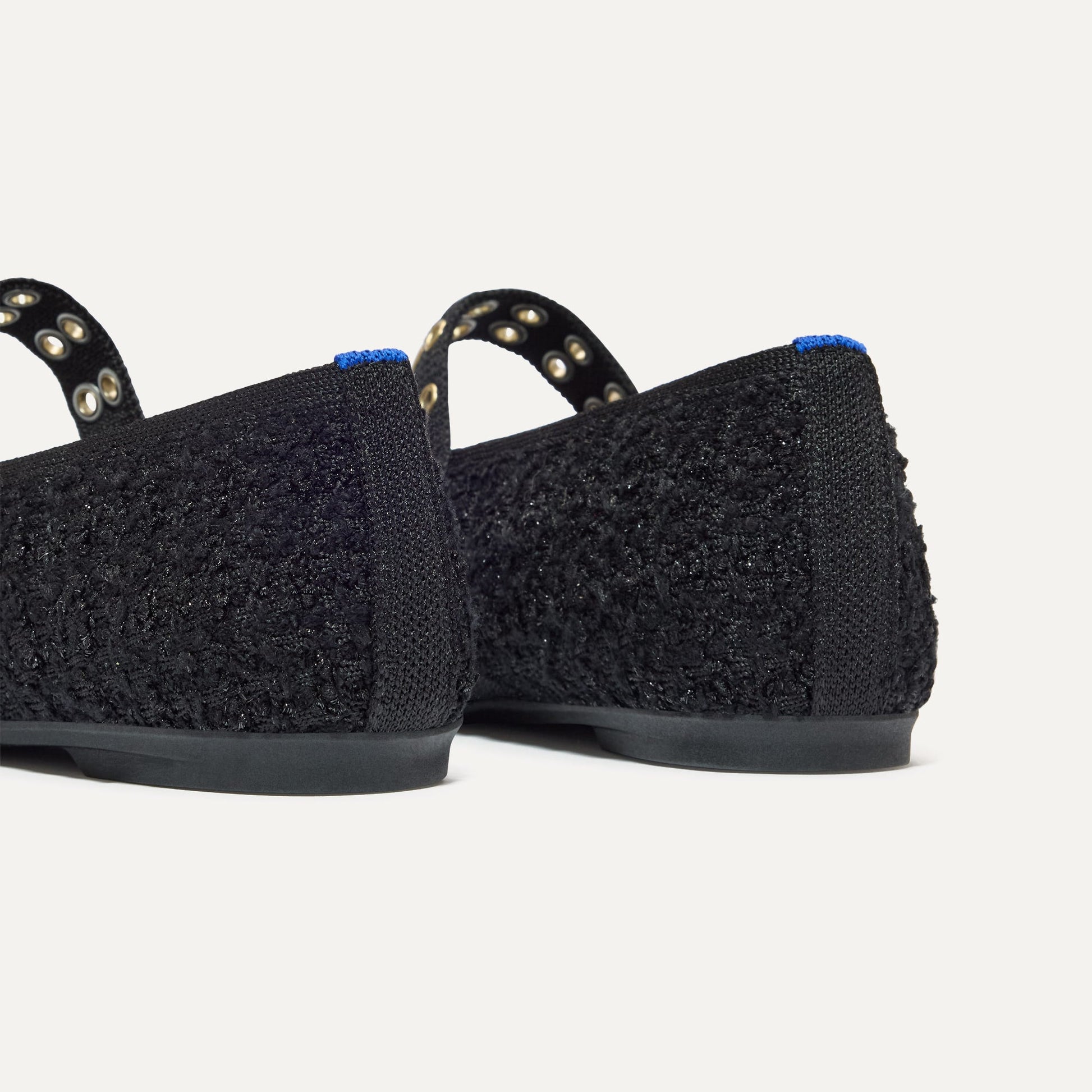 - Knit bouclé upper in shimmery black with a square toe box and a sharp V-shaped vamp.